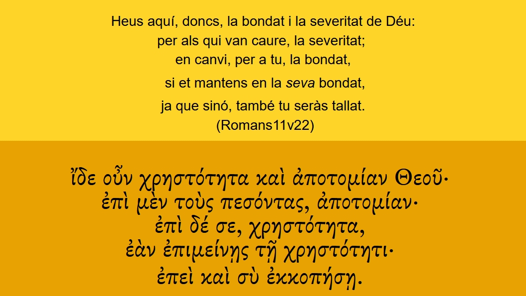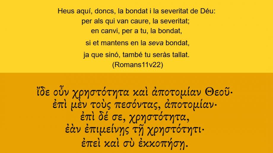 Romans 11v22 Heus aquí, doncs, la bondat i la severitat de Déu: per als qui van caure, la severitat; en canvi, per a tu, la bondat, si et mantens en la [seva] bondat, ja que sinó, també tu seràs tallat. ἴδε οὖν χρηστότητα καὶ ἀποτομίαν Θεοῦ· ἐπὶ μὲν τοὺς πεσόντας, ἀποτομίαν· ἐπὶ δέ σε, χρηστότητα, ἐὰν ἐπιμείνῃς τῇ χρηστότητι· ἐπεὶ καὶ σὺ ἐκκοπήσῃ.