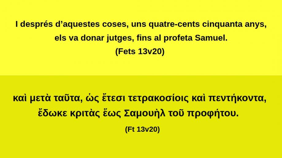 Fets 13v20 I després d’aquestes coses, uns quatre-cents cinquanta anys, els va donar jutges, fins al profeta Samuel. καὶ μετὰ ταῦτα, ὡς ἔτεσι τετρακοσίοις καὶ πεντήκοντα, ἔδωκε κριτὰς ἕως Σαμουὴλ τοῦ προφήτου. (Ft 13v20)