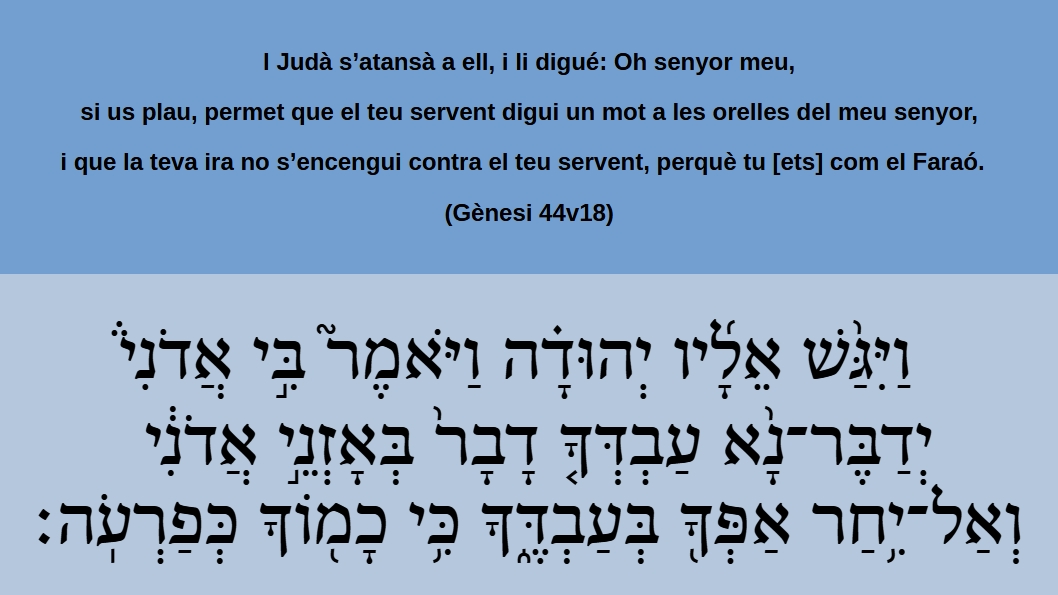 Gènesi 44v18 I Judà s’atansà a ell, i li digué: Oh senyor meu, si us plau, permet que el teu servent digui un mot a les orelles del meu senyor, i que la teva ira no s’encengui contra el teu servent, perquè tu [ets] com el Faraó. § וַיִּגַּ֨שׁ אֵלָ֜יו יְהוּדָ֗הֿ וַיֹּאֿמֶר֘ בִּ֣י אֲדֹֿנִי֒ יְדַֿבֶּר־נָ֨א עַבְֿדְּךָֿ֤ דָֿבָֿר֙ בְּאָזְנֵ֣י אֲדֹֿנִ֔י וְאַל־יִ֥חַר אַפְּךָֿ֖ בְּעַבְֿדֶּ֑ךָֿ כִּ֥י כָֿמ֖וֹךָֿ כְּפַֿרְעֹֽהֿ׃ (Gn 44v18) §