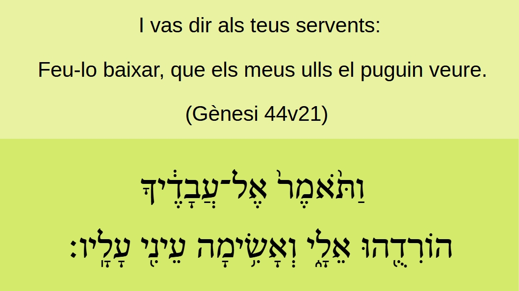 Gènesi 44v19 El meu senyor va preguntar als seus servents: Teniu pare o [algun altre] germà?אֲדֹֿנִ֣י שָׁאַ֔ל אֶתֿ־עֲבָֿדָֿ֖יו לֵאֿמֹ֑ר הֲיֵשׁ־לָכֶֿ֥ם אָ֖בֿ אוֹ־אָֽח׃ (Gn 44v19)