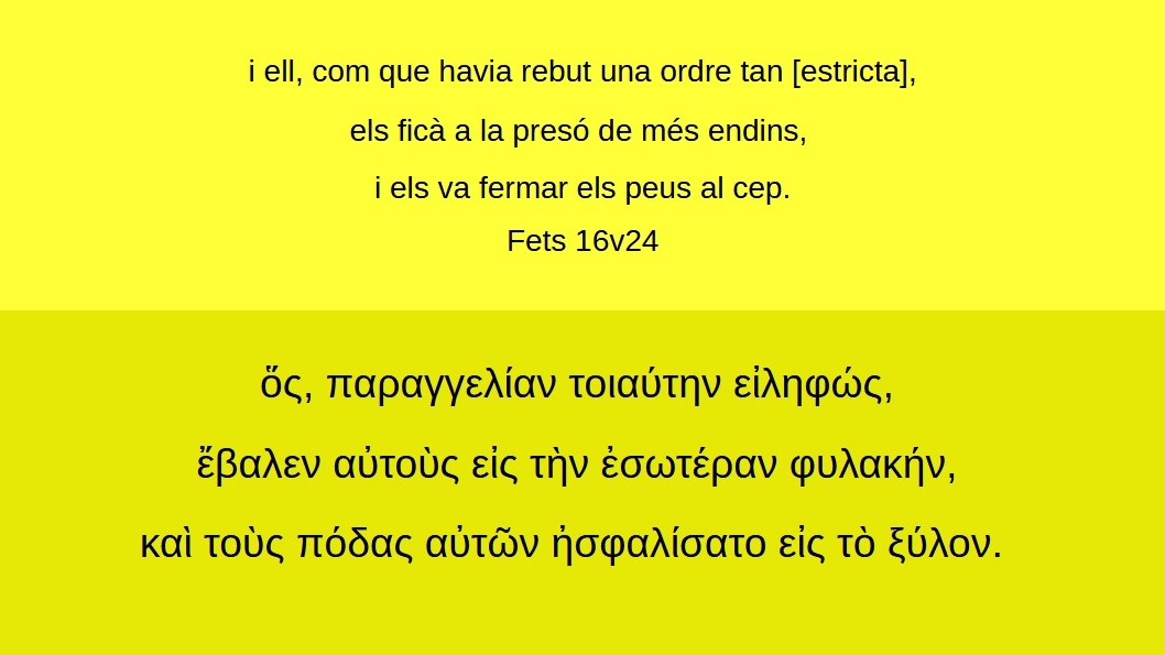 Fets 16v24 i ell, com que havia rebut una ordre tan [estricta], els ficà a la presó de més endins, i els va fermar els peus al cep.ὅς, παραγγελίαν τοιαύτην εἰληφώς, ἔβαλεν αὐτοὺς εἰς τὴν ἐσωτέραν φυλακήν, καὶ τοὺς πόδας αὐτῶν ἠσφαλίσατο εἰς τὸ ξύλον. (Ft 16v24)