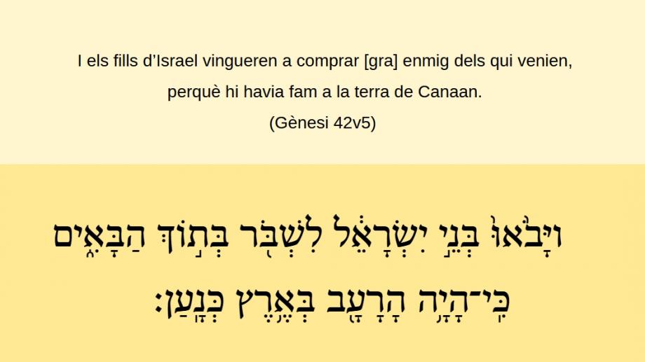 Gènesi 42v5 I els fills d’Israel vingueren a comprar [gra] enmig dels qui venien, perquè hi havia fam a la terra de Canaan. וַיָּבֹ֙אוּ֙ בְּנֵ֣י יִשְׂרָאֵ֔ל לִשְׁבֹּ֖ר בְּתֿ֣וֹךְֿ הַבָּאִ֑ים כִּֽי־הָיָ֥הֿ הָֽרָעָ֖בֿ בְּאֶ֥רֶץ כְּנָֽעַן׃ (Gn 42v5)