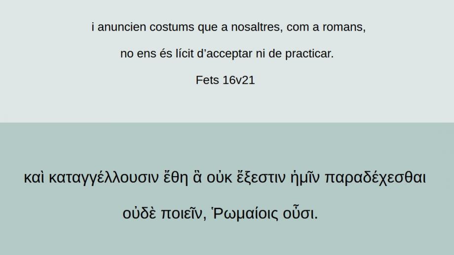 Fets 16v21 i anuncien costums que a nosaltres, com a romans, no ens és lícit d’acceptar ni de practicar.καὶ καταγγέλλουσιν ἔθη ἃ οὐκ ἔξεστιν ἡμῖν παραδέχεσθαι οὐδὲ ποιεῖν, Ῥωμαίοις οὖσι. (Ft 16v21)