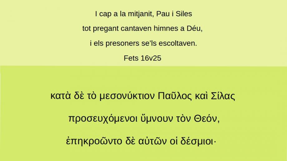 Fets 16v25 I cap a la mitjanit, Pau i Siles tot pregant cantaven himnes a Déu, i els presoners se’ls escoltaven. κατὰ δὲ τὸ μεσονύκτιον Παῦλος καὶ Σίλας προσευχόμενοι ὕμνουν τὸν Θεόν, ἐπηκροῶντο δὲ αὐτῶν οἱ δέσμιοι· (Ft 16v25)