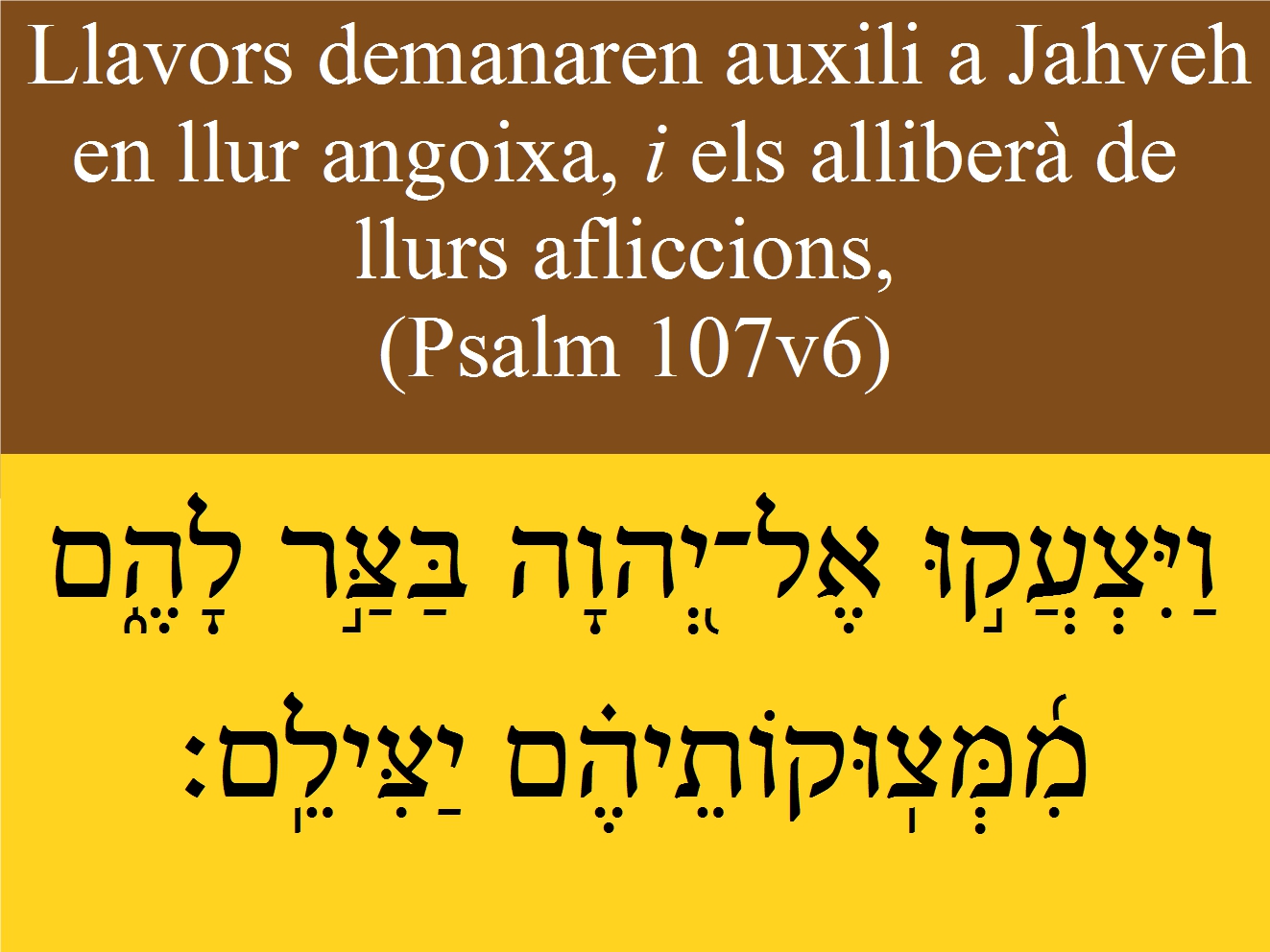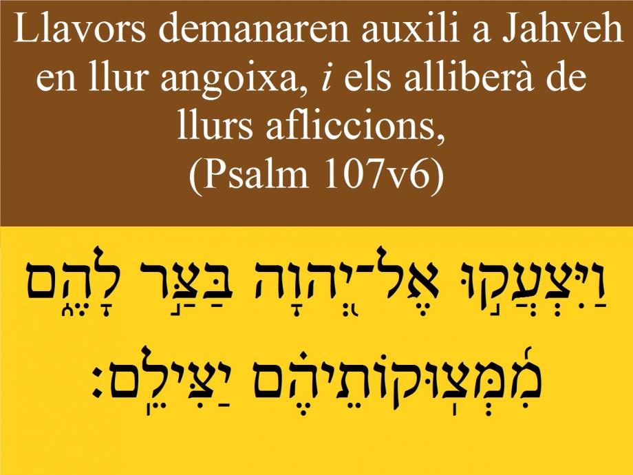 Psalm 107v6 Llavors demanaren auxili a Jahveh en llur angoixa, i els alliberà de llurs afliccions,