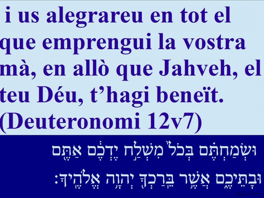 Deuteronomi 12v7 I vosaltres i les vostres famílies menjareu davant Jahveh, el vostre Déu, i us alegrareu en tot el que emprengui la vostra mà, en allò que Jahveh, el teu Déu, t’hagi beneït. וַאֲכַלְתֶּם־שָׁ֗ם לִפְנֵי֙ יְהוָ֣ה אֱלֹֽהֵיכֶ֔ם וּשְׂמַחְתֶּ֗