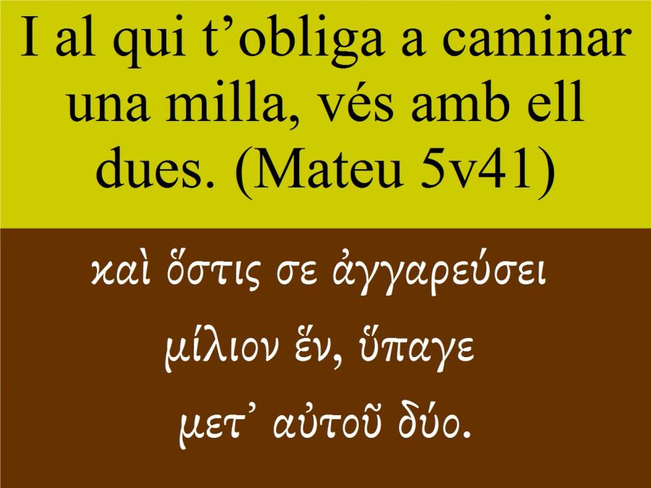 Mateu 5v41 I al qui t’obliga a caminar una milla, vés amb ell dues. καὶ ὅστις σε ἀγγαρεύσει μίλιον ἕν, ὕπαγε μετ᾽ αὐτοῦ δύο.