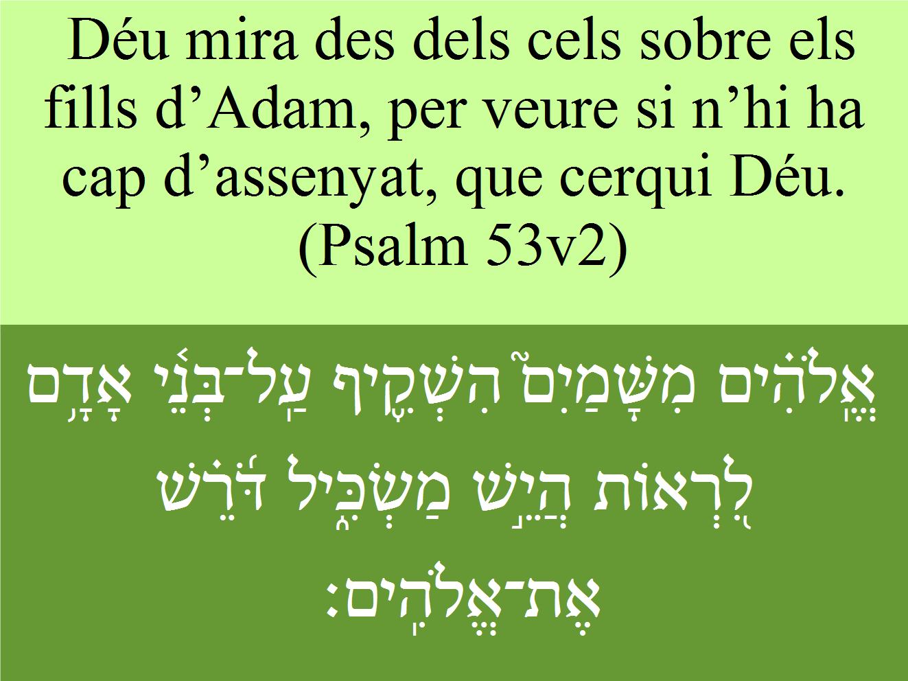 Psalm 53v2 Déu mira des dels cels sobre els fills d’Adam, per veure si n’hi ha cap d’assenyat, que cerqui Déu.