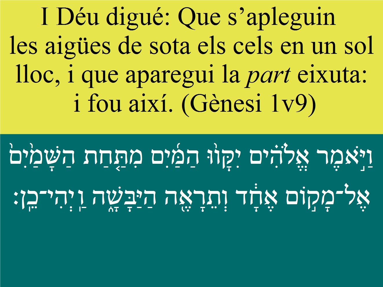 Gènesi 1v9 I Déu digué: Que s’apleguin les aigües de sota els cels en un sol lloc, i que aparegui la part eixuta: i fou així.