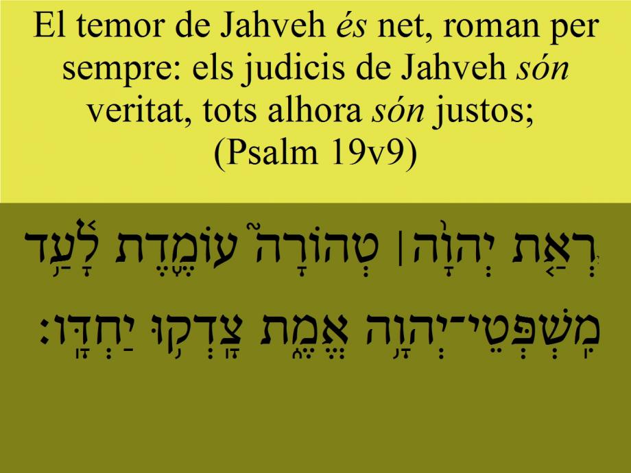 Psalm 19v9 El temor de Jahveh és net, roman per sempre: els judicis de Jahveh són veritat, tots alhora són justos;