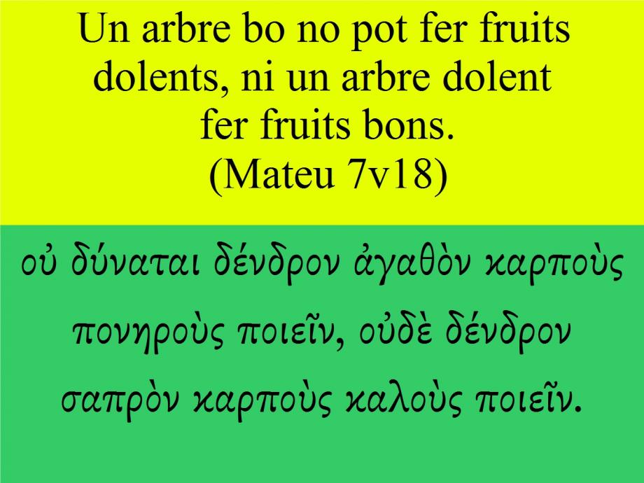 Mateu 7v18 Un arbre bo no pot fer fruits dolents, ni un arbre dolent fer fruits bons. οὐ δύναται δένδρον ἀγαθὸν καρποὺς πονηροὺς ποιεῖν, οὐδὲ δένδρον σαπρὸν καρποὺς καλοὺς ποιεῖν.
