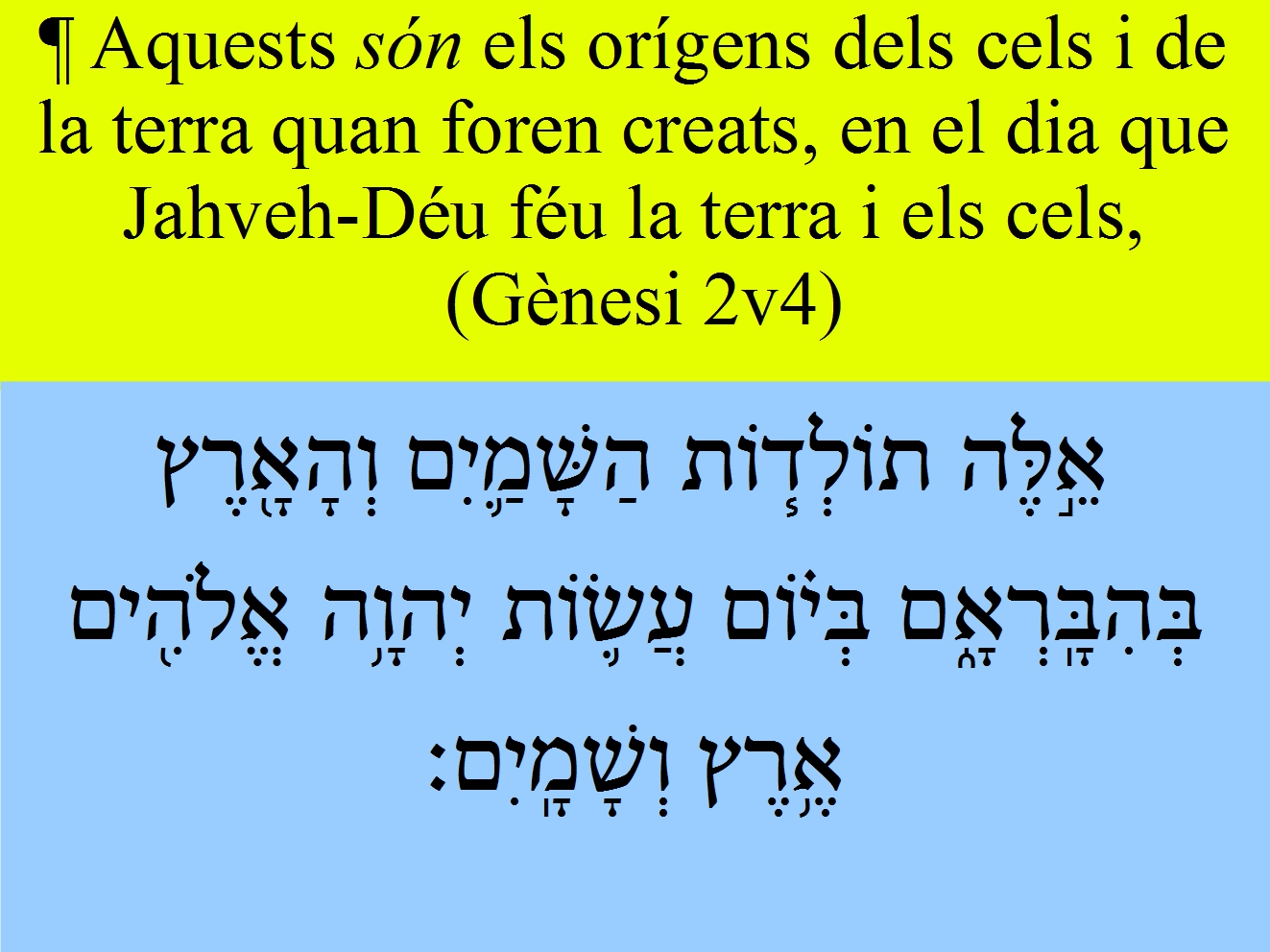 Gènesi 2v4 ¶ Aquests són els orígens dels cels i de la terra quan foren creats, en el dia que Jahveh-Déu féu la terra i els cels,