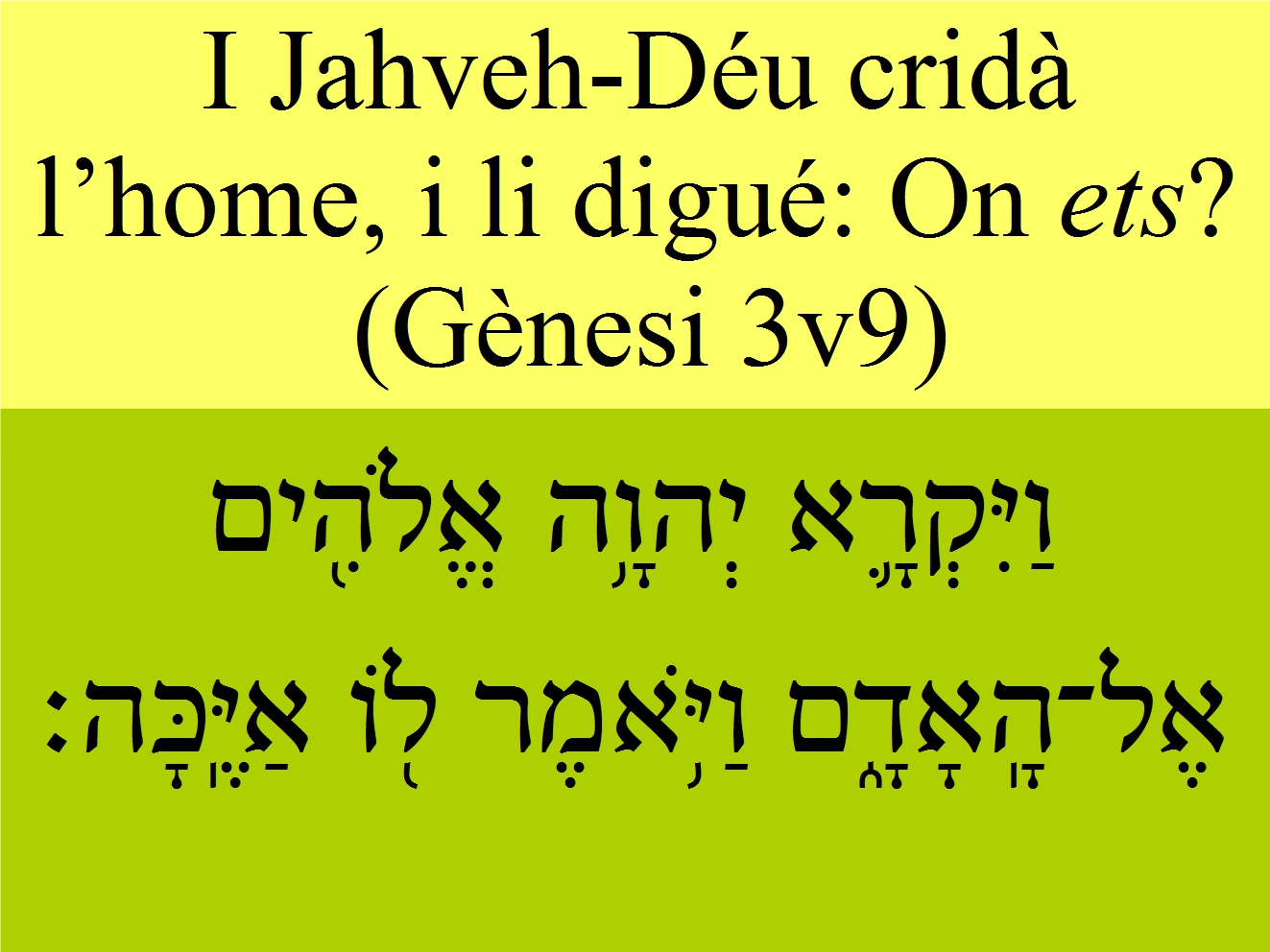 Data: 2015-06-02, dimartsComentari: Gènesi 3v9 I Jahveh-Déu cridà l’home, i li digué: On ets? וַיִּקְרָ֛א יְהוָ֥ה אֱלֹהִ֖ים אֶל־הָֽאָדָ֑ם וַיֹּ֥אמֶר ל֖וֹ אַיֶּֽכָּה׃