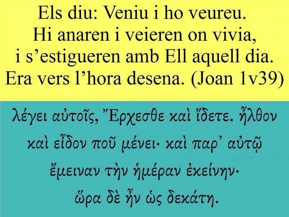 Joan 1v39 Els diu: Veniu i ho veureu. Hi anaren i veieren on vivia, i s’estigueren amb ell aquell dia. Era vers l’hora desena.
