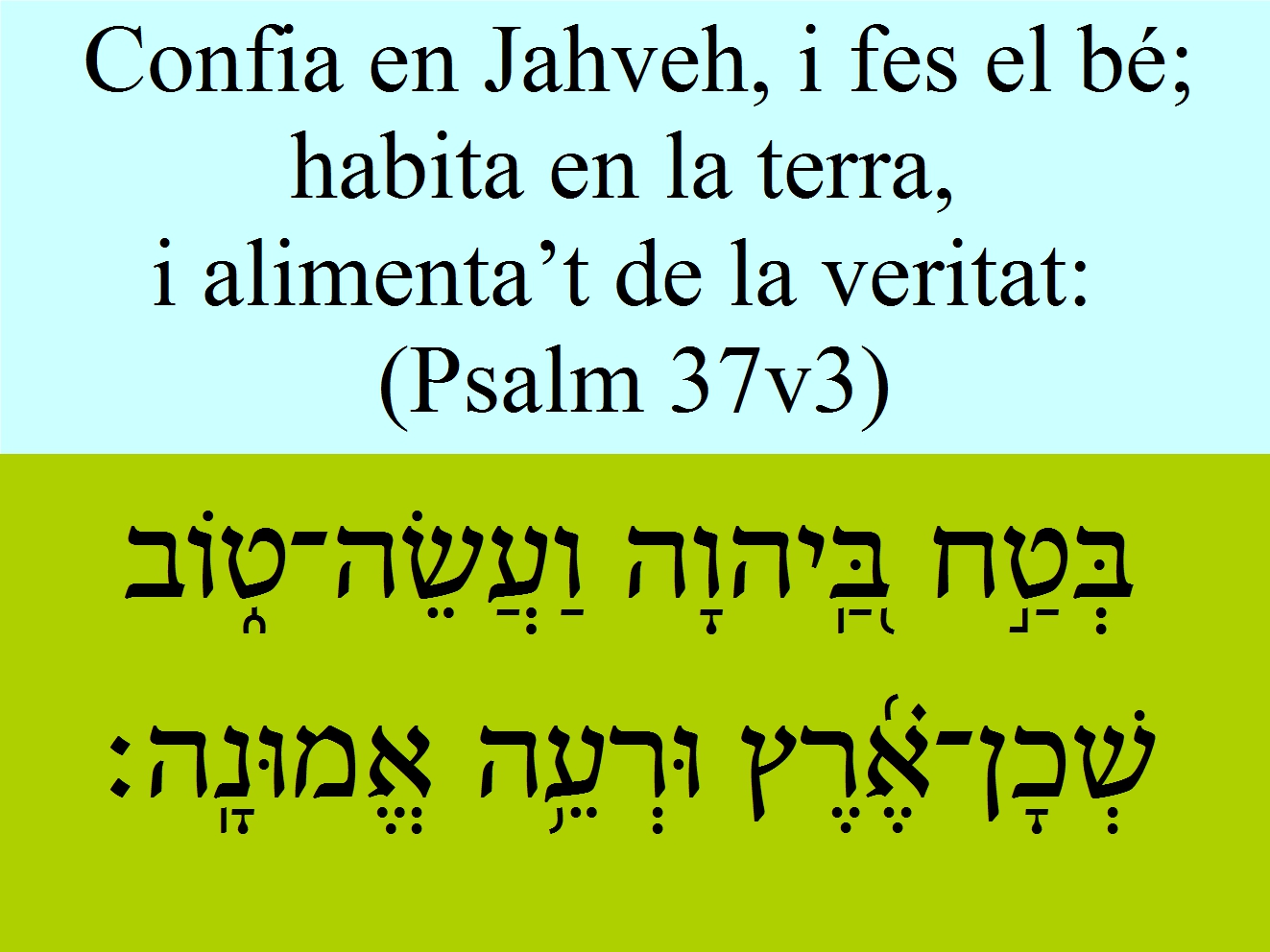Psalm 37v3 Confia en Jahveh, i fes el bé; habita en la terra, i alimenta’t de la veritat: בְּטַ֣ח בַּֽ֭יהוָה וַעֲשֵׂה־ט֑וֹב שְׁכָן־אֶ֗֜רֶץ וּרְעֵ֥ה אֱמוּנָֽה׃
