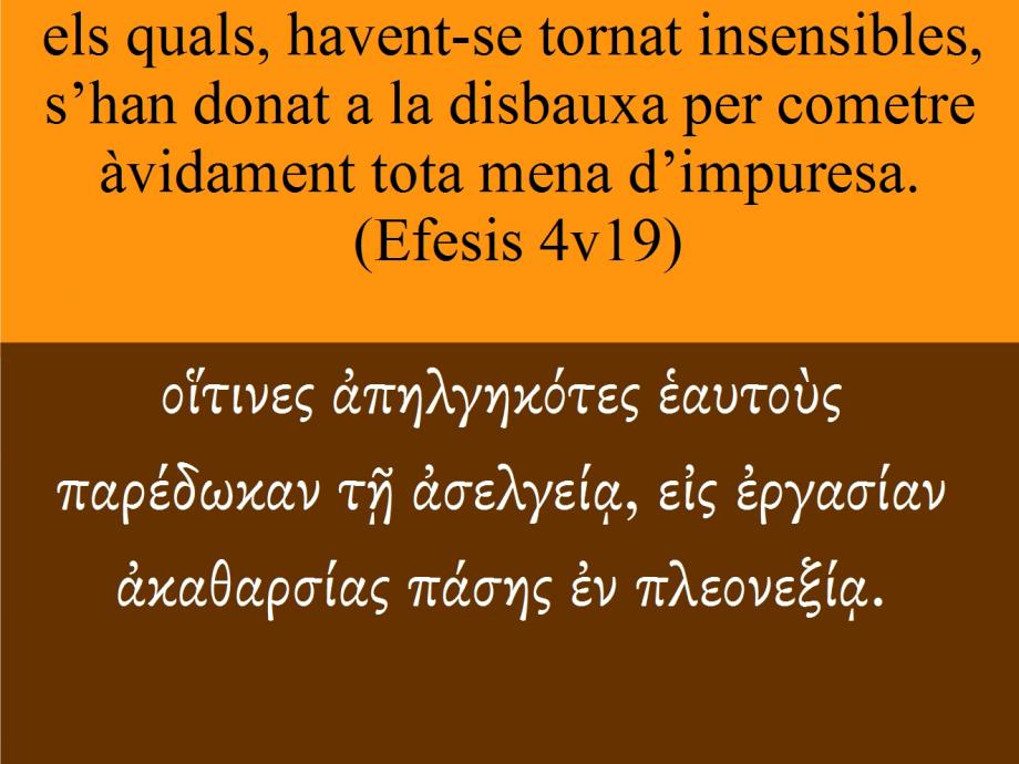 Efesis 4v19 els quals, havent-se tornat insensibles, s’han donat a la disbauxa per cometre àvidament tota mena d’impuresa.