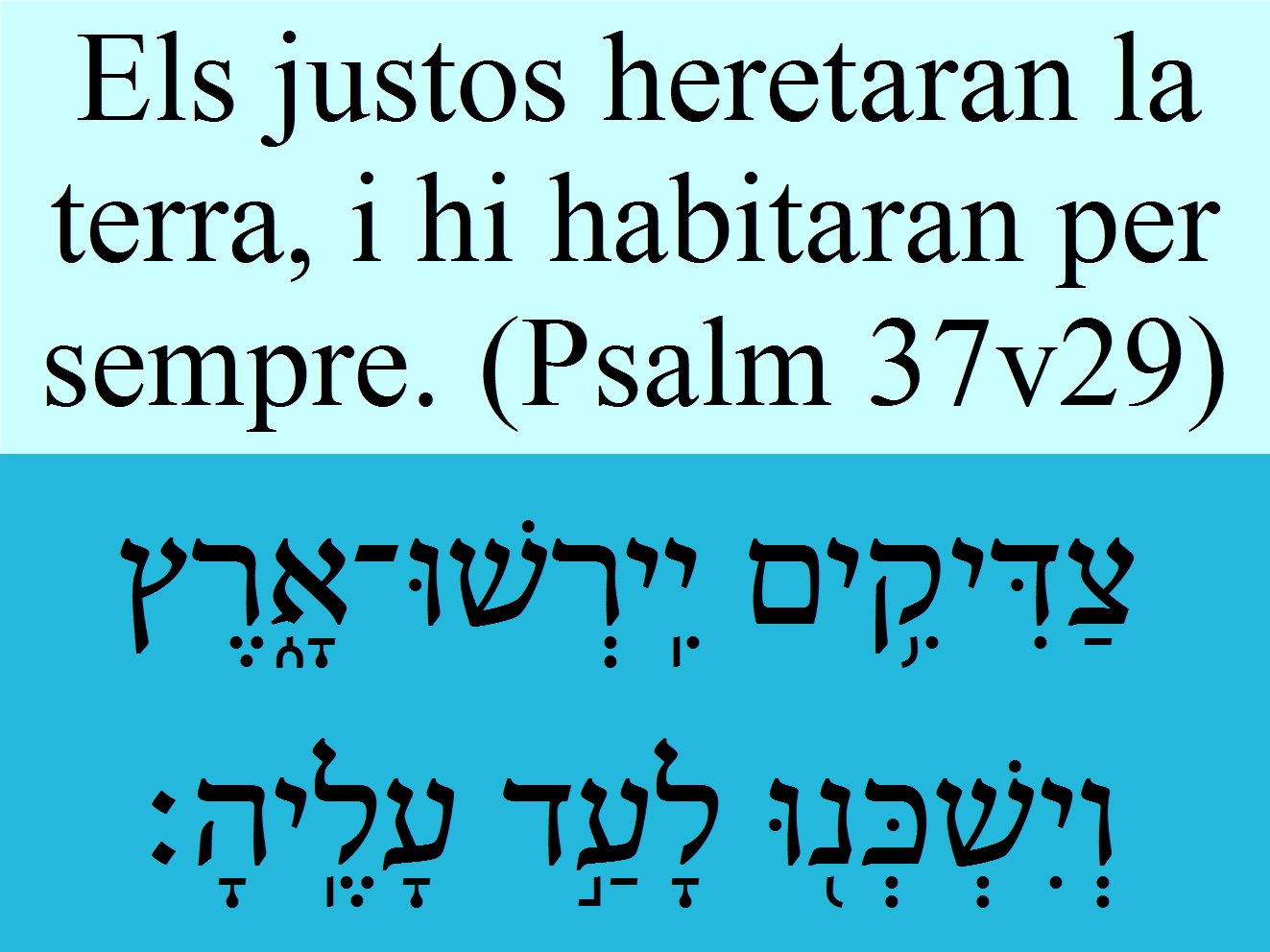 Data: 2015-08-16, diumengeComentari: Psalm 37v29 Els justos heretaran la terra, i hi habitaran per sempre. צַדִּיקִ֥ים יִֽירְשׁוּ־אָ֑רֶץ וְיִשְׁכְּנ֖וּ לָעַ֣ד עָלֶֽיהָ׃