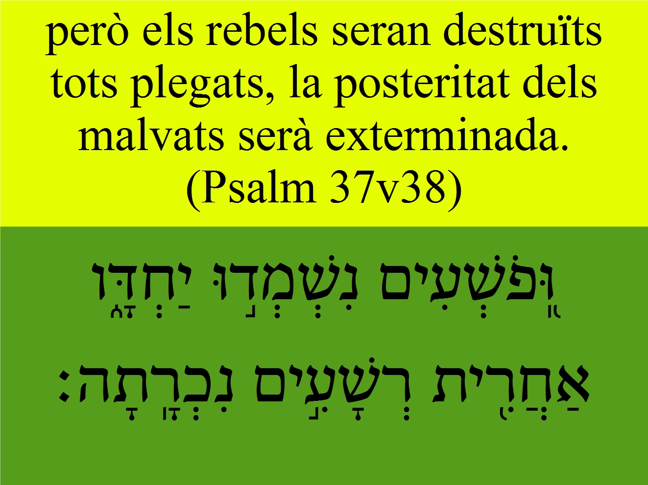 Psalm 37v38 però els rebels seran destruïts tots plegats, la posteritat dels malvats serà exterminada. וּֽ֭פֹשְׁעִים נִשְׁמְד֣וּ יַחְדָּ֑ו אַחֲרִ֖ית רְשָׁעִ֣ים נִכְרָֽתָה׃