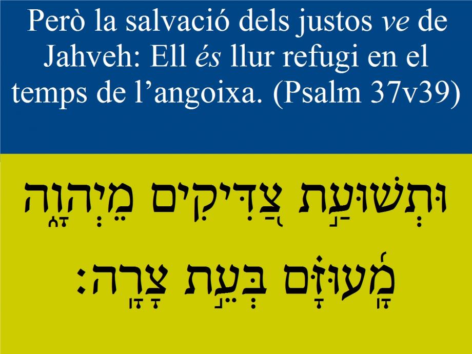 Psalm 37v39 Però la salvació dels justos ve de Jahveh: Ell és llur refugi en el temps de l’angoixa. וּתְשׁוּעַ֣ת צַ֭דִּיקִים מֵיְהוָ֑ה מָֽ֜עוּזָּ֗ם בְּעֵ֣ת צָרָֽה׃