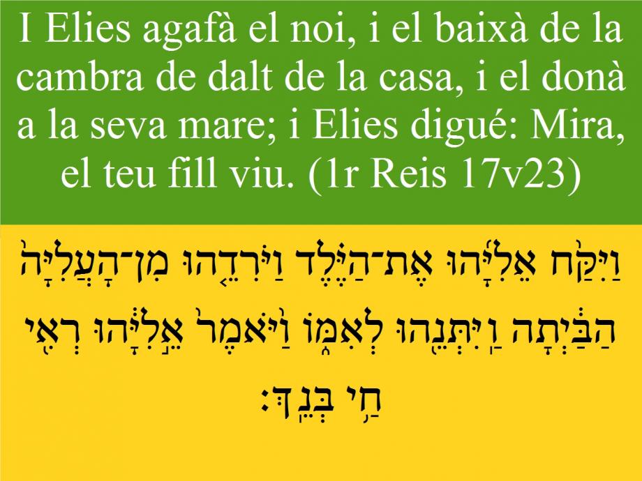 1r Reis 17v23 I Elies agafà el noi, i el baixà de la cambra de dalt de la casa, i el donà a la seva mare; i Elies digué: Mira, el teu fill viu.