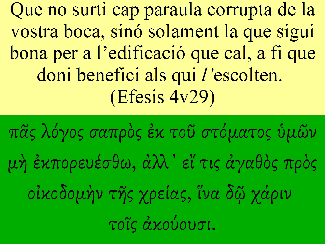 Efesis 4v29 Que no surti cap paraula corrupta de la vostra boca, sinó solament la que sigui bona per a l’edificació que cal, a fi que doni benefici als qui l’escolten.
