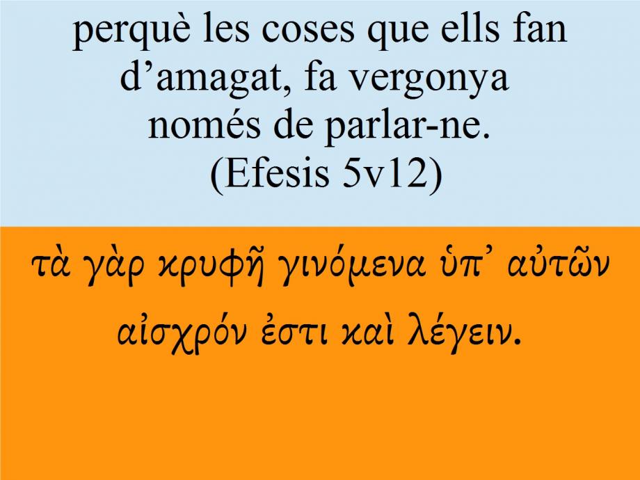 Efesis 5v12 perquè les coses que ells fan d’amagat, fa vergonya només de parlar-ne. τὰ γὰρ κρυφῆ γινόμενα ὑπ᾽ αὐτῶν αἰσχρόν ἐστι καὶ λέγειν.