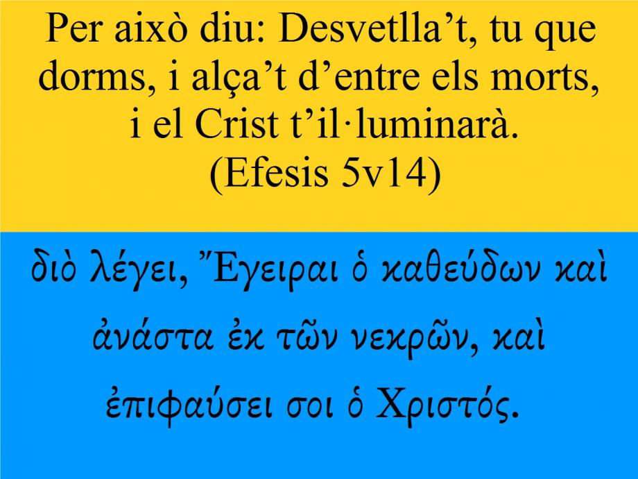Efesis 5v14 Per això diu: Desvetlla’t, tu que dorms, i alça’t d’entre els morts, i el Crist t’il·luminarà.