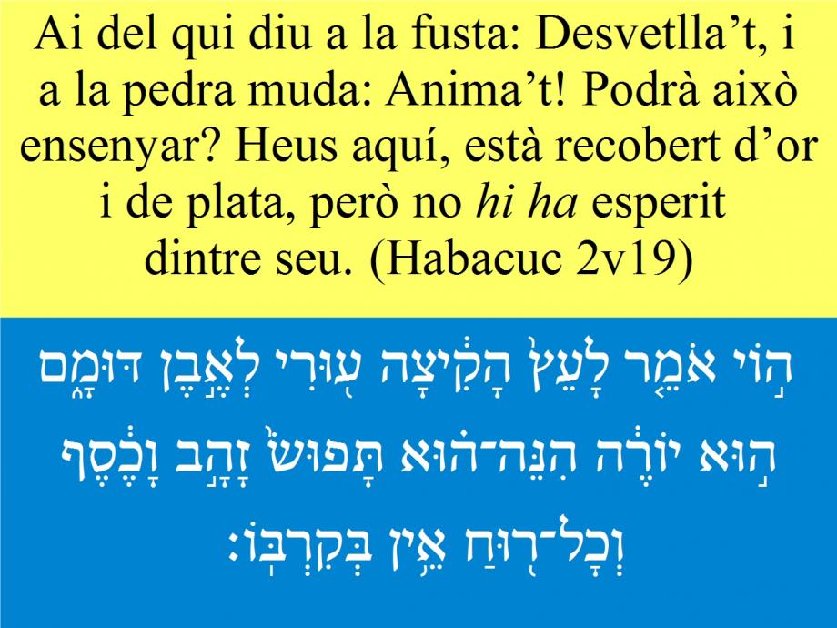 Habacuc 2v19 Ai del qui diu a la fusta: Desvetlla’t, i a la pedra muda: Anima’t! Podrà això ensenyar? Heus aquí, està recobert d’or i de plata, però no hi ha esperit dintre seu.