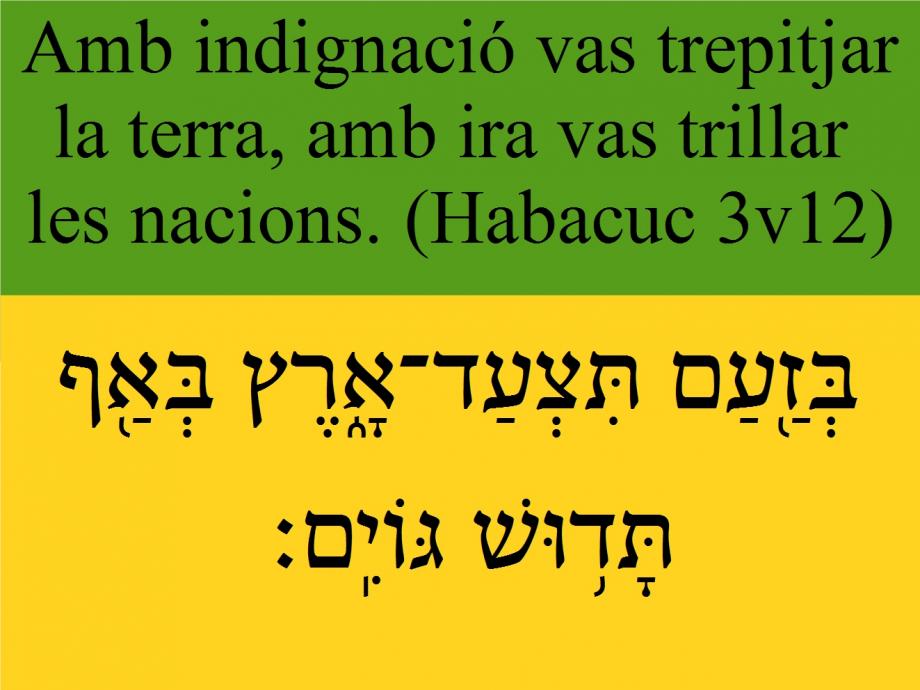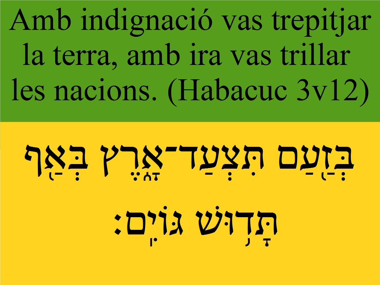 Data: 2015-12-19, dissabteComentari: Habacuc 3v12 Amb indignació vas trepitjar la terra, amb ira vas trillar les nacions. בְּזַ֖עַם תִּצְעַד־אָ֑רֶץ בְּאַ֖ף תָּד֥וּשׁ גּוֹיִֽם׃