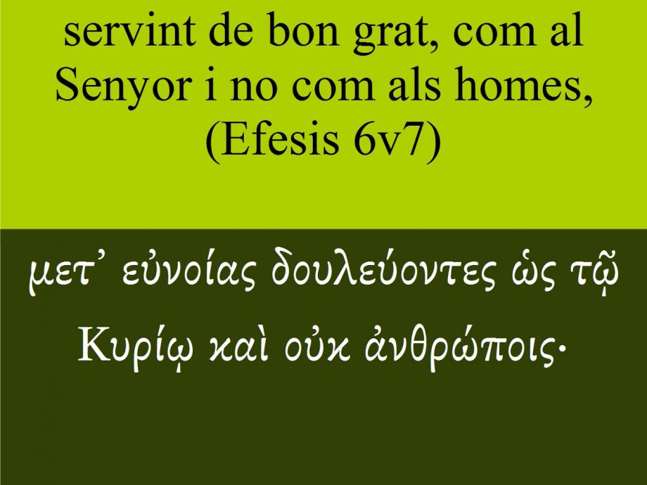 Data: 2016-01-03, diumengeComentari: Efesis 6v7 servint de bon grat, com al Senyor i no com als homes, μετ᾽ εὐνοίας δουλεύοντες ὡς τῷ Κυρίῳ καὶ οὐκ ἀνθρώποις·