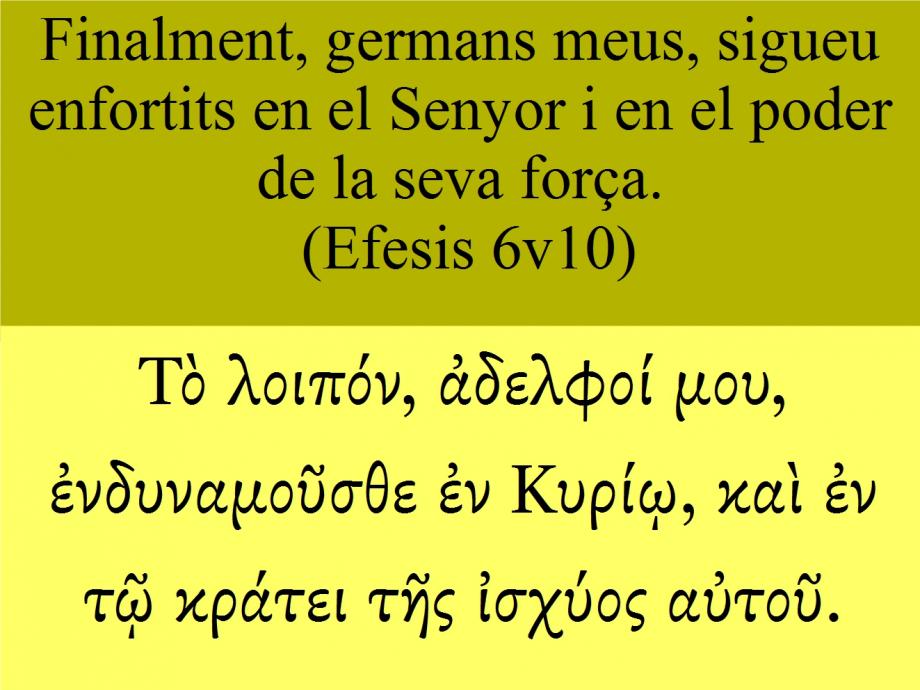 Efesis 6v10 Finalment, germans meus, sigueu enfortits en el Senyor i en el poder de la seva força. Τὸ λοιπόν, ἀδελφοί μου, ἐνδυναμοῦσθε ἐν Κυρίῳ, καὶ ἐν τῷ κράτει τῆς ἰσχύος αὐτοῦ.