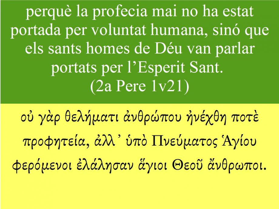 2a Pere 1v21 perquè la profecia mai no ha estat portada per voluntat humana, sinó que els sants homes de Déu van parlar portats per l’Esperit Sant.