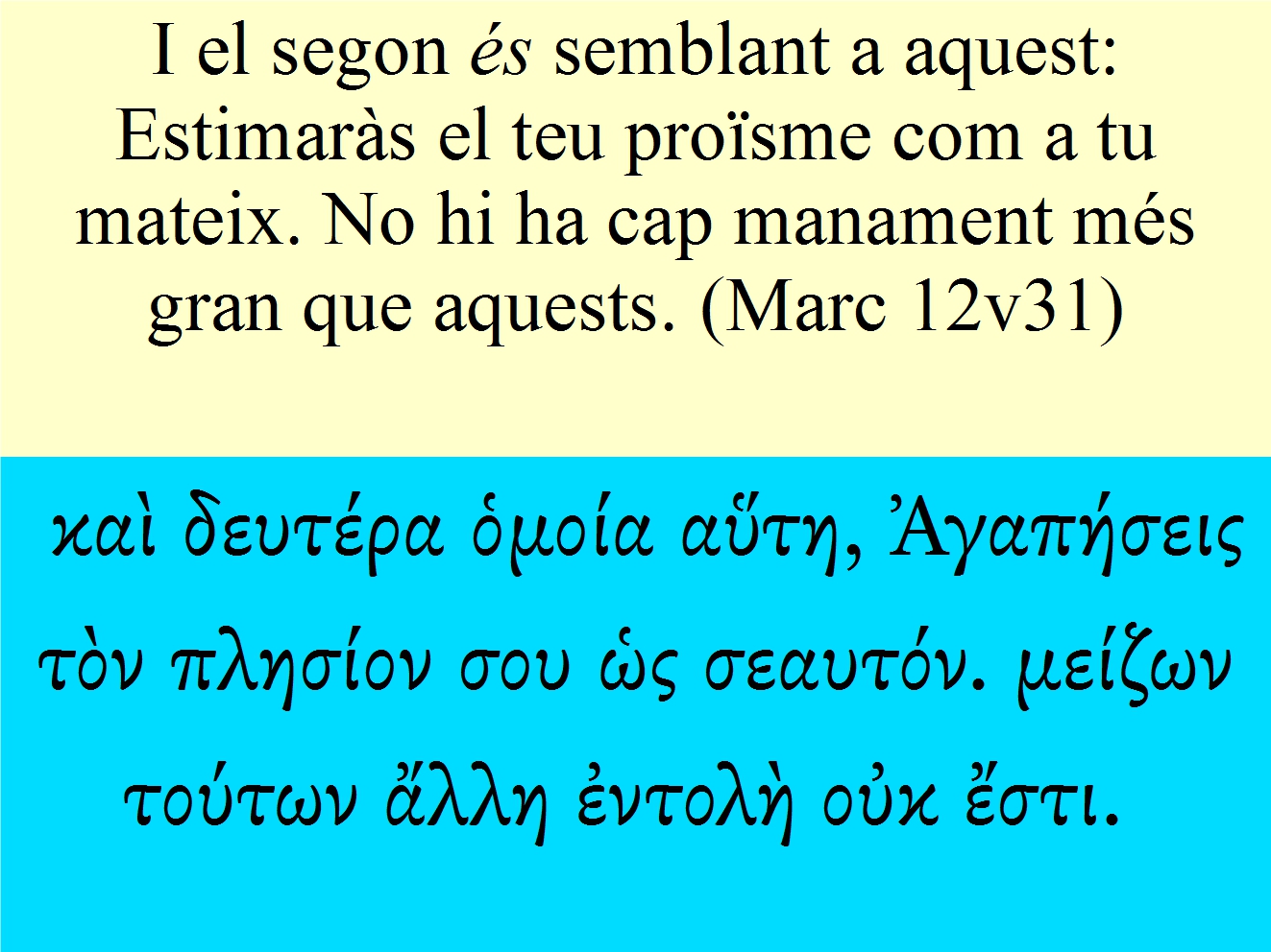 Marc 12v31 I el segon és semblant a aquest: Estimaràs el teu proïsme com a tu mateix. No hi ha cap manament més gran que aquests.