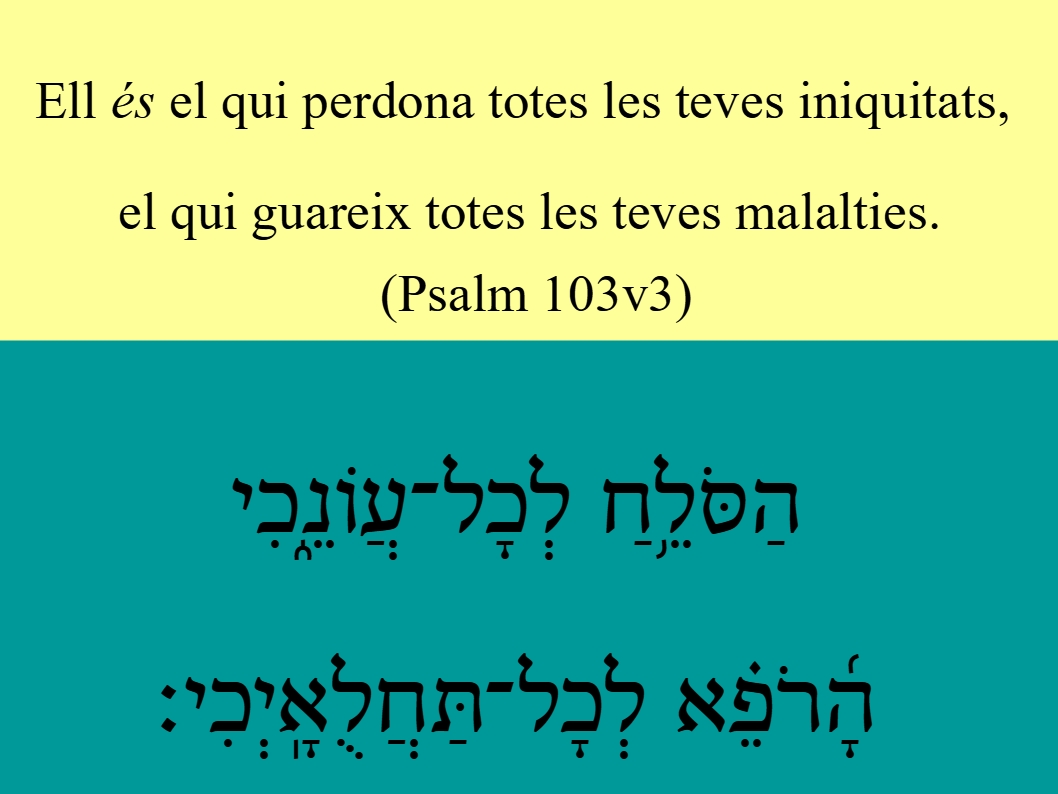 Psalms 103v3 Ell és el qui perdona totes les teves iniquitats, el qui guareix totes les teves malalties. WTT Psalms 103v3 הַסֹּלֵ֥חַ לְכָל־עֲוֹנֵ֑כִי הָ֜רֹפֵ֗א לְכָל־תַּחֲלֻאָֽיְכִי׃ SVV Psalms 103v3 Die al uw ongerechtigheid <05771> vergeeft <05545> (08802), die al uw krankheden <08463> geneest <07495> (08802);ESV Psalms 103v3 who a-forgives all your iniquity, who b-heals all your diseases,GNV Psalms 103v3 Which forgiueth all thine iniquitie, and healeth all thine infirmities. Who forgiveth <05545> (08802) all thine iniquities <05771>; who healeth <07495> (08802) all thy diseases <08463>;BCI Psalms 103v3 (102:3) Ell et perdona les culpes1 i et guareix de tota malaltia;CCC Psalms 103v3 Ell és el qui perdona totes les teves iniquitats, el qui guareix totes les teves malalties.