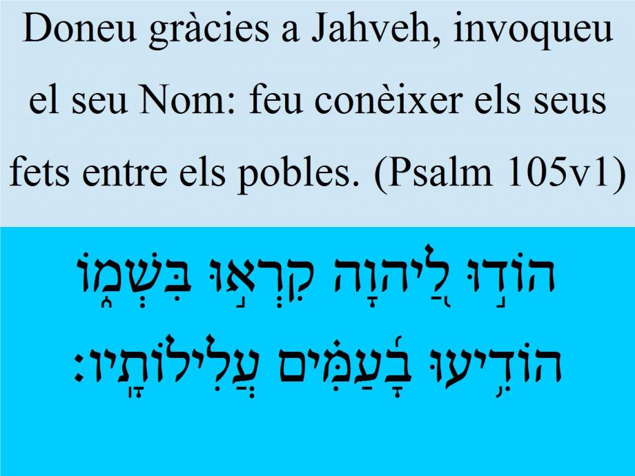 Psalm 105v1 Doneu gràcies a Jahveh, invoqueu el seu Nom: feu conèixer els seus fets entre els pobles. הוֹד֣וּ לַ֭יהוָה קִרְא֣וּ בִּשְׁמ֑וֹ הוֹדִ֥יעוּ בָ֜עַמִּ֗ים עֲלִילוֹתָֽיו׃