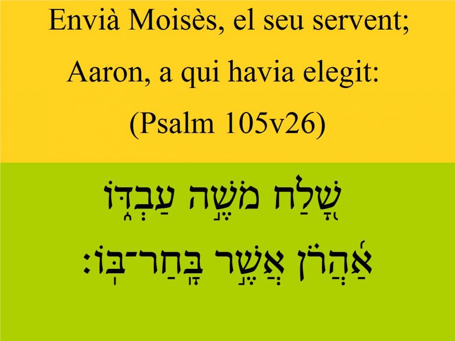 Psalm 105v26 Envià Moisès, el seu servent; Aaron, a qui havia elegit: שָׁ֭לַח מֹשֶׁ֣ה עַבְדּ֑וֹ אַ֜הֲרֹ֗ן אֲשֶׁ֣ר בָּֽחַר־בּֽוֹ׃