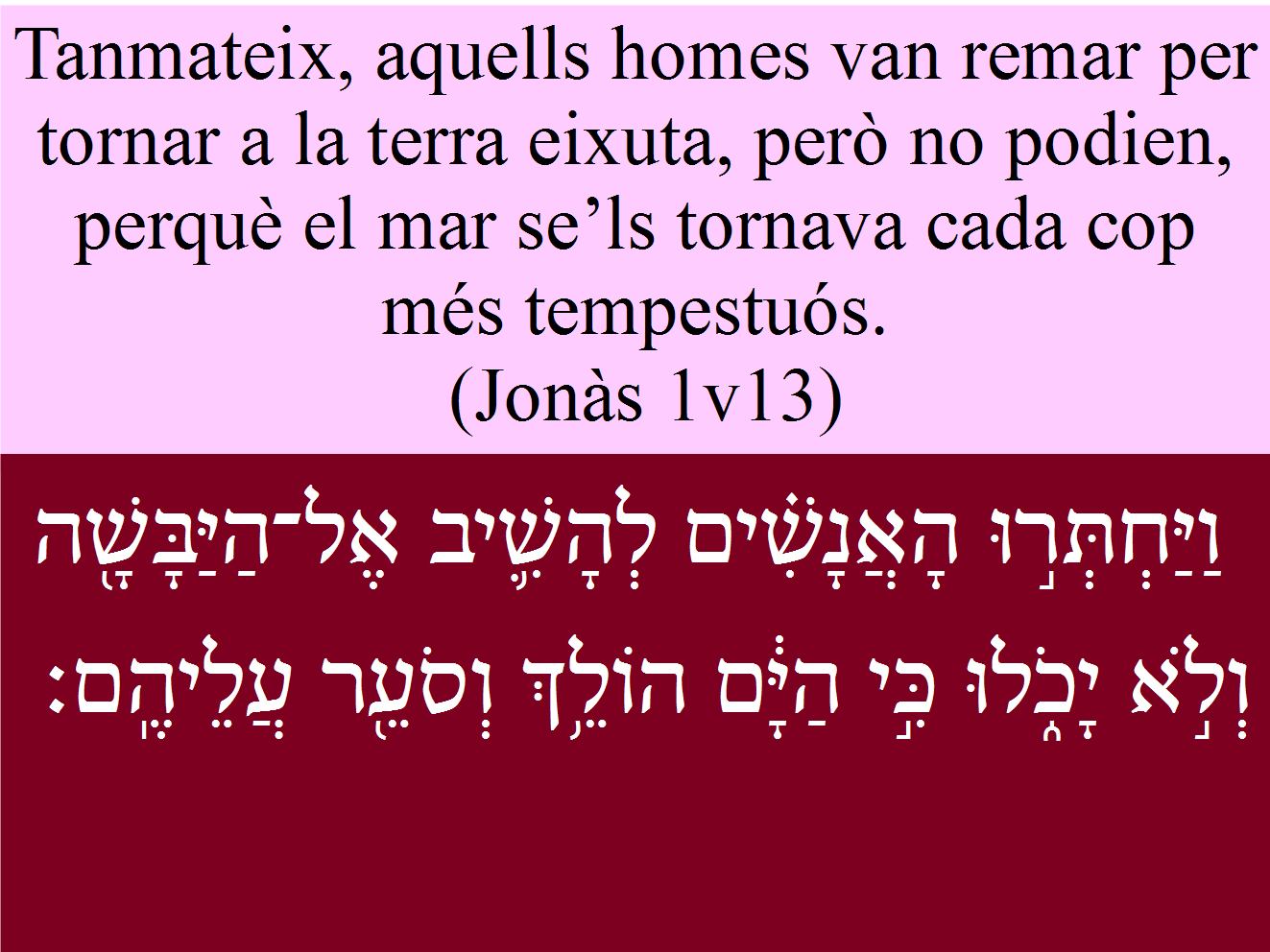 Jonàs 1v13 Tanmateix, aquells homes van remar per tornar a la terra eixuta, però no podien, perquè el mar se’ls tornava cada cop més tempestuós.