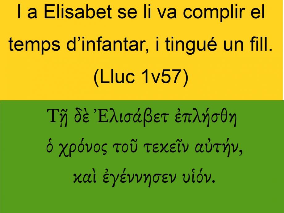 Lluc 1v57 I a Elisabet se li va complir el temps d’infantar, i tingué un fill.Τῇ δὲ Ἐλισάβετ ἐπλήσθη ὁ χρόνος τοῦ τεκεῖν αὐτήν, καὶ ἐγέννησεν υἱόν.Now <1161> Elisabeth's <1665> full <4130> <0> time <5550> came <4130> (5681) that she <846> should be delivered <5088> (5629); and <2532> she brought forth <1080> (5656) a son <5207>.