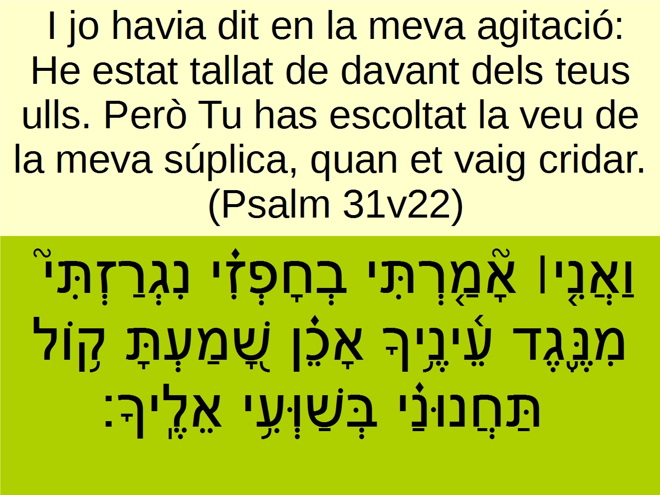 Psalm 31v22 I jo havia dit en la meva agitació: He estat tallat de davant dels teus ulls. Però Tu has escoltat la veu de la meva súplica, quan et vaig cridar. וַאֲנִ֤י׀ אָ֘מַ֤רְתִּי בְחָפְזִ֗י נִגְרַזְתִּי֮ מִנֶּ֪גֶד עֵ֫ינֶ֥יךָ אָכֵ֗ן שָׁ֭מַעְתָּ ק֥וֹל ת
