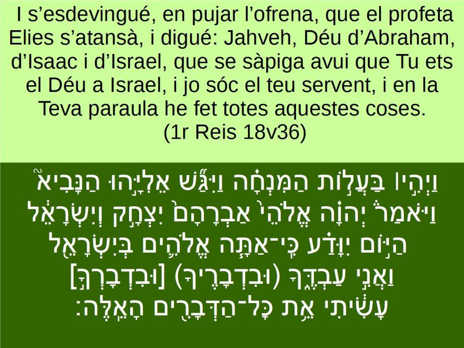 1r Reis 18v36 I s’esdevingué, en pujar l’ofrena, que el profeta Elies s’atansà, i digué: Jahveh, Déu d’Abraham, d’Isaac i d’Israel, que se sàpiga avui que Tu ets el Déu a Israel, i jo sóc el teu servent, i en la Teva paraula he fet totes aquestes coses. וַיְהִ֣י׀ בַּעֲל֣וֹת הַמִּנְחָ֗ה וַיִּגַּ֞שׁ אֵלִיָּ֣הוּ הַנָּבִיא֮ וַיֹּאמַר֒ יְהוָ֗ה אֱלֹהֵי֙ אַבְרָהָם֙ יִצְחָ֣ק וְיִשְׂרָאֵ֔ל הַיּ֣וֹם יִוָּדַ֗ע כִּֽי־אַתָּ֧ה אֱלֹהִ֛ים בְּיִשְׂרָאֵ֖ל וַאֲנִ֣י עַבְדֶּ֑ךָ (וּבִדְבָרֶיךָ) [וּבִדְבָרְךָ֣] עָשִׂ֔יתִי אֵ֥ת כָּל־הַדְּבָרִ֖ים הָאֵֽלֶּה׃ And it came to pass at the time of the offering <05927> (08800) of the evening sacrifice <04503>, that Elijah <0452> the prophet <05030> came near <05066> (08799), and said <0559> (08799), LORD <03068> God <0430> of Abraham <085>, Isaac <03327>, and of Israel <03478>, let it be known <03045> (08735) this day <03117> that thou art God <0430> in Israel <03478>, and that I am thy servant <05650>, and that I have done <06213> (08804) all these things at thy word <01697>.