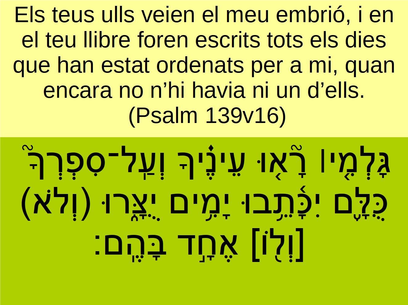 Psalm139v16 Els teus ulls veien el meu embrió, i en el teu llibre foren escrits tots els dies que han estat ordenats per a mi, quan encara no n’hi havia ni un d’ells. גָּלְמִ֤י׀ רָ֘א֤וּ עֵינֶ֗יךָ וְעַֽל־סִפְרְךָ֮ כֻּלָּ֪ם יִכָּ֫תֵ֥בוּ יָמִ֥ים יֻצָּ֑רוּ (וְלֹא) [וְל֖וֹ] אֶחָ֣ד בָּהֶֽם׃ Thine eyes <05869> did see <07200> (08804) my substance, yet being unperfect; <01564> and in thy book <05612> all my members were written <03789> (08735), which in continuance <03117> were fashioned <03335> (08795), when as yet there was none <0259> of them.