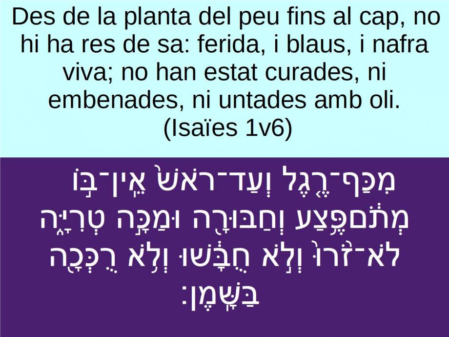 Isaïes 1v6 Des de la planta del peu fins al cap, no hi ha res de sa: ferida, i blaus, i nafra viva; no han estat curades, ni embenades, ni untades amb oli. מִכַּף־רֶ֤גֶל וְעַד־רֹאשׁ֙ אֵֽין־בּ֣וֹ מְתֹ֔ם פֶּ֥צַע וְחַבּוּרָ֖ה וּמַכָּ֣ה טְרִיָּ֑ה לֹא־֙זֹרוּ֙ וְלֹ֣א חֻבָּ֔שׁוּ וְלֹ֥א רֻכְּכָ֖ה בַּשָּֽׁמֶן׃ From the sole <03709> of the foot <07272> even unto the head <07218> there is no soundness <04974> in it; but wounds <06482>, and bruises <02250>, and putrifying <02961> sores <04347>: they have not been closed, <02115> (08804) neither bound up <02280> (08795), neither mollified <07401> (08795) with ointment <08081>.