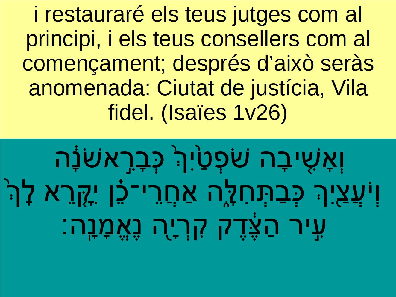 Isaïes 1v26 i restauraré els teus jutges com al principi, i els teus consellers com al començament; després d’això seràs anomenada: Ciutat de justícia, Vila fidel. וְאָשִׁ֤יבָה שֹׁפְטַ֙יִךְ֙ כְּבָרִ֣אשֹׁנָ֔ה וְיֹעֲצַ֖יִךְ כְּבַתְּחִלָּ֑ה אַחֲרֵי־כֵ֗ן יִקָּ֤רֵא לָךְ֙ עִ֣יר הַצֶּ֔דֶק קִרְיָ֖ה נֶאֱמָנָֽה׃  And I will restore <07725> (08686) thy judges <08199> (08802) as at the first <07223>, and thy counsellors <03289> (08802) as at the beginning <08462>: afterward <0310> thou shalt be called <07121> (08735), The city <05892> of righteousness <06664>, the faithful <0539> (08737) city <07151>.