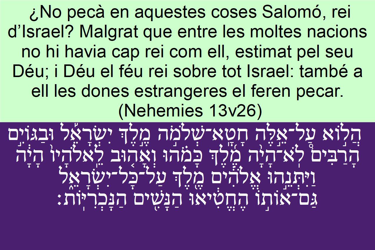 Nehemies 13v26 ¿No pecà en aquestes coses Salomó, rei d’Israel? Malgrat que entre les moltes nacions no hi havia cap rei com ell, estimat pel seu Déu; i Déu el féu rei sobre tot Israel: també a ell les dones estrangeres el feren pecar. הֲל֣וֹא עַל־אֵ֣לֶּה חָטָֽא־שְׁלֹמֹ֣ה מֶ֣לֶךְ יִשְׂרָאֵ֡ל וּבַגּוֹיִ֣ם הָרַבִּים֩ לֹֽא־הָיָ֙ה מֶ֜לֶךְ כָּמֹ֗הוּ וְאָה֤וּב לֵֽאלֹהָיו֙ הָיָ֔ה וַיִּתְּנֵ֣הוּ אֱלֹהִ֔ים מֶ֖לֶךְ עַל־כָּל־יִשְׂרָאֵ֑ל גַּם־אוֹת֣וֹ הֶחֱטִ֔יאוּ הַנָּשִׁ֖ים הַנָּכְרִיּֽוֹת׃ Did not Solomon <08010> king <04428> of Israel <03478> sin <02398> (08804) by these things? yet among many <07227> nations <01471> was there no king <04428> like him, who was beloved <0157> (08803) of his God <0430>, and God <0430> made <05414> (08799) him king <04428> over all Israel <03478>: nevertheless even him <01571> did outlandish <05237> women <0802> cause to sin <02398> (08689).