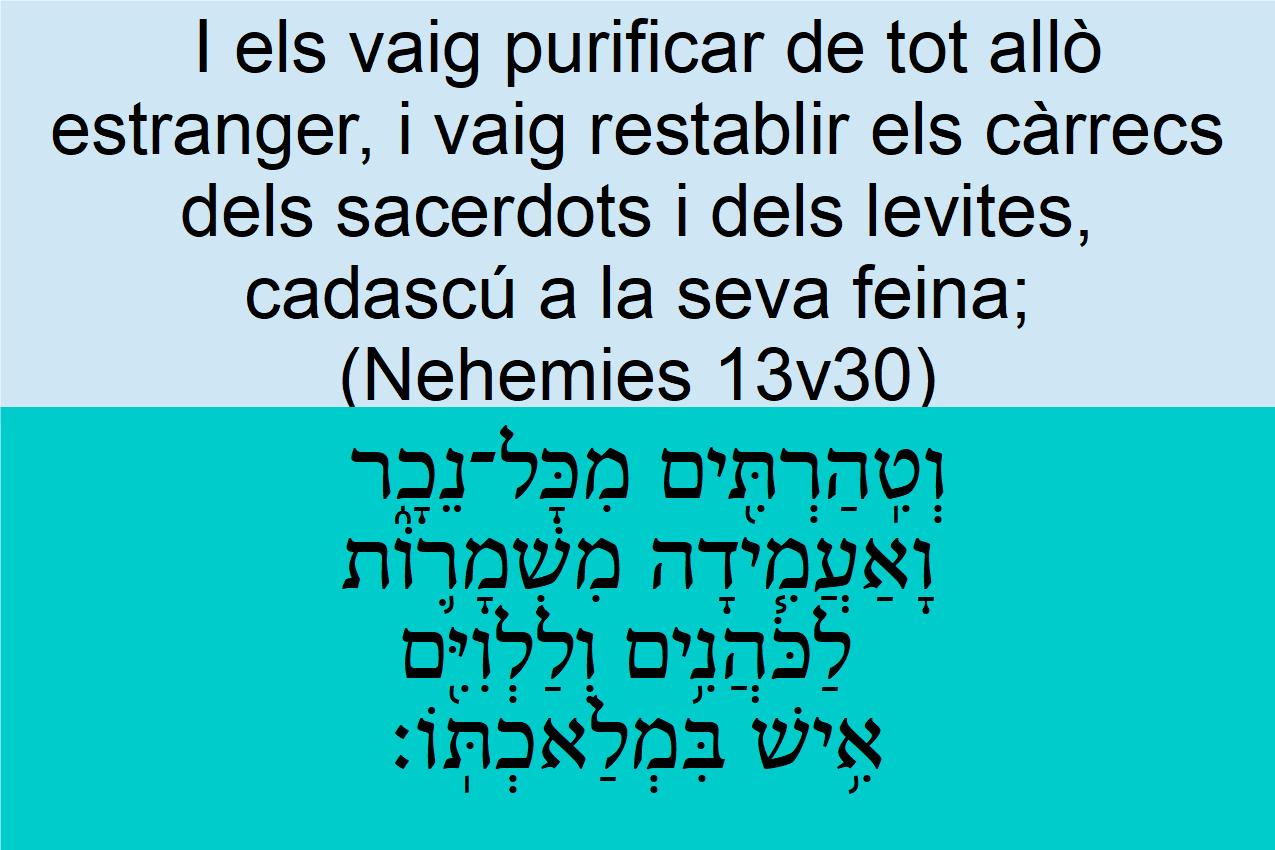 Nehemies 13v30 I els vaig purificar de tot allò estranger, i vaig restablir els càrrecs dels sacerdots i dels levites, cadascú a la seva feina; וְטִֽהַרְתִּ֖ים מִכָּל־נֵכָ֑ר וָאַעֲמִ֧ידָה מִשְׁמָר֛וֹת לַכֹּהֲנִ֥ים וְלַלְוִיִּ֖ם אִ֥ישׁ בִּמְלַאכְתּֽוֹ׃ Thus cleansed <02891> (08765) I them from all strangers <05236>, and appointed <05975> (08686) the wards <04931> of the priests <03548> and the Levites <03881>, every one <0376> in his business <04399>;