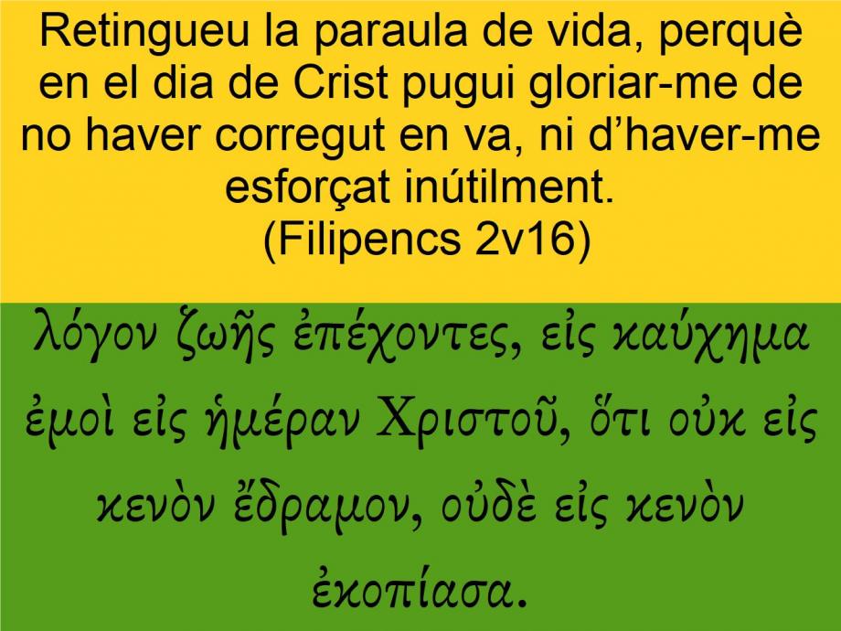 Filipencs 2v16 Retingueu la paraula de vida, perquè en el dia de Crist pugui gloriar-me de no haver corregut en va, ni d’haver-me esforçat inútilment. λόγον ζωῆς ἐπέχοντες, εἰς καύχημα ἐμοὶ εἰς ἡμέραν Χριστοῦ, ὅτι οὐκ εἰς κενὸν ἔδραμον, οὐδὲ εἰς κενὸν ἐκοπίασα.Holding forth <1907> (5723) the word <3056> of life; <2222> that <1519> I <1698> may rejoice <2745> in <1519> the day <2250> of Christ <5547>, that <3754> I have <5143> <0> not <3756> run <5143> (5627) in <1519> vain <2756>, neither <3761> laboured <2872> (5656) in <1519> vain <2756>.