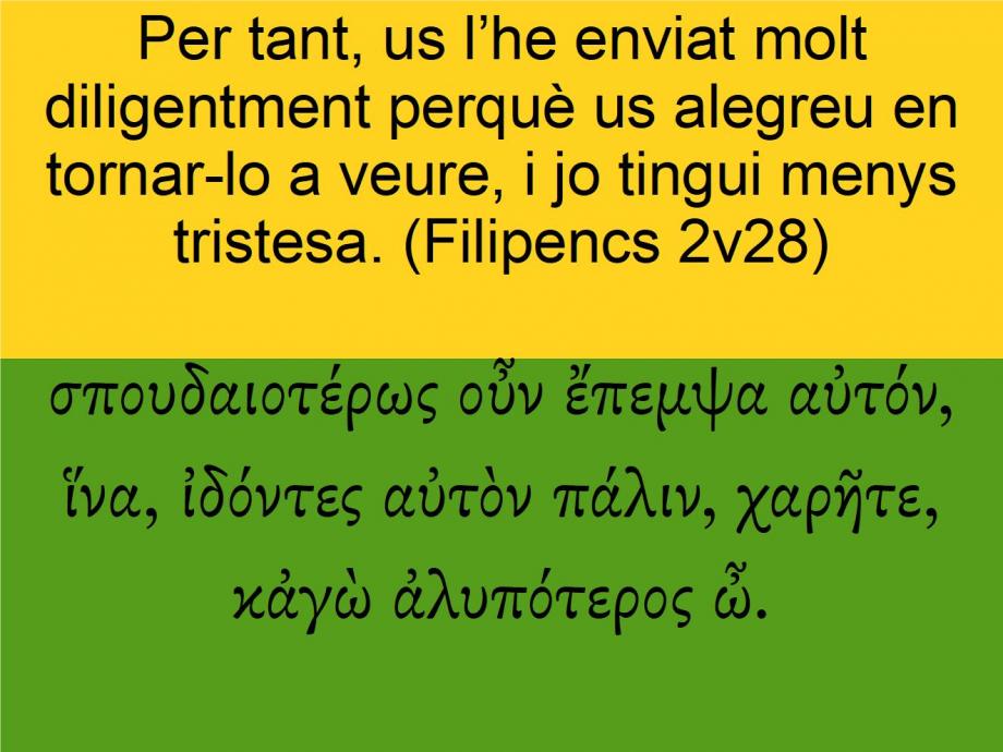 Filipencs 2v28 Per tant, us l’he enviat molt diligentment perquè us alegreu en tornar-lo a veure, i jo tingui menys tristesa. σπουδαιοτέρως οὖν ἔπεμψα αὐτόν, ἵνα, ἰδόντες αὐτὸν πάλιν, χαρῆτε, κἀγὼ ἀλυπότερος ὦ. I sent <3992> (5656) him <846> therefore <3767> the more carefully <4708>, that <2443>, when ye see <1492> (5631) him <846> again <3825>, ye may rejoice <5463> (5647), and that I <2504> may be <5600> (5753) the less sorrowful <253>.