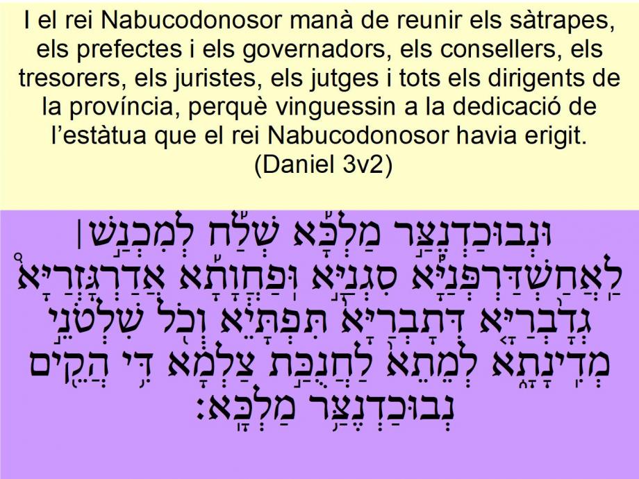 Daniel 3v2 I el rei Nabucodonosor manà de reunir els sàtrapes, els prefectes i els governadors, els consellers, els tresorers, els juristes, els jutges i tots els dirigents de la província, perquè vinguessin a la dedicació de l’estàtua que el rei Nabucodonosor havia erigit. וּנְבוּכַדְנֶצַּ֣ר מַלְכָּ֡א שְׁלַ֡ח לְמִכְנַ֣שׁ׀ לַֽאֲחַשְׁדַּרְפְּנַיָּ֡א סִגְנַיָּ֣א וּֽפַחֲוָתָ֡א אֲדַרְגָּזְרַיָּא֩ גְדָ֙בְרַיָּ֤א דְּתָבְרַיָּא֙ תִּפְתָּיֵ֔א וְכֹ֖ל שִׁלְטֹנֵ֣י מְדִֽינָתָ֑א לְמֵתֵא֙ לַחֲנֻכַּ֣ת צַלְמָ֔א דִּ֥י הֲקֵ֖ים נְבוּכַדְנֶצַּ֥ר מַלְכָּֽא׃ Then Nebuchadnezzar <05020> the king <04430> sent <07972> (08754) to gather together <03673> (08749) the princes <0324>, the governors <05460>, and the captains <06347>, the judges <0148>, the treasurers <01411>, the counsellors <01884>, the sheriffs <08614>, and all <03606> the rulers <07984> of the provinces <04083>, to come <0858> (08749) to the dedication <02597> of the image <06755> which Nebuchadnezzar <05020> the king <04430> had set up <06966> (08684).