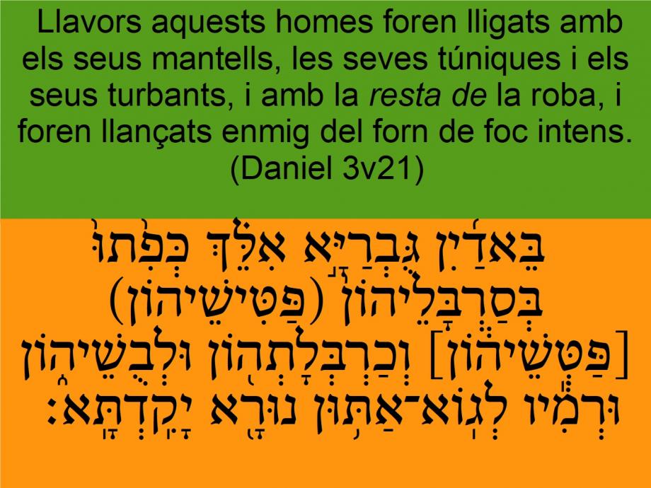 Daniel 3v21 Llavors aquests homes foren lligats amb els seus mantells, les seves túniques i els seus turbants, i amb la resta de la roba, i foren llançats enmig del forn de foc intens. בֵּאדַ֜יִן גֻּבְרַיָּ֣א אִלֵּ֗ךְ כְּפִ֙תוּ֙ בְּסַרְבָּלֵיהוֹן֙ (פַּטִּישֵׁיהוֹן) [פַּטְּשֵׁיה֔וֹן] וְכַרְבְּלָתְה֖וֹן וּלְבֻשֵׁיה֑וֹן וּרְמִ֕יו לְגֽוֹא־אַתּ֥וּן נוּרָ֖א יָקִֽדְתָּֽא׃ Then <0116> these <0479> men <01400> were bound <03729> (08760) in their coats <05622>, their hosen <06361> (08675) <06361>, and their hats <03737>, and their other garments <03831>, and were cast <07412> (08752) into the midst <01459> of the burning <03345> (08751) fiery <05135> furnace <0861>.
