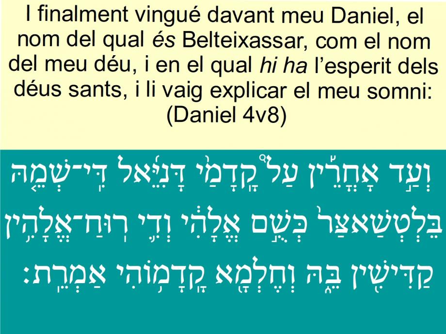 Daniel 4v8 I finalment vingué davant meu Daniel, el nom del qual és Belteixassar, com el nom del meu déu, i en el qual hi ha l’esperit dels déus sants, i li vaig explicar el meu somni: וְעַ֣ד אָחֳרֵ֡ין עַל֩ קָֽדָמַ֙י דָּנִיֵּ֜אל דִּֽי־שְׁמֵ֤הּ בֵּלְטְשַׁאצַּר֙ כְּשֻׁ֣ם אֱלָהִ֔י וְדִ֛י רֽוּחַ־אֱלָהִ֥ין קַדִּישִׁ֖ין בֵּ֑הּ וְחֶלְמָ֖א קָֽדָמ֥וֹהִי אַמְרֵֽת׃ But at <05705> the last <0318> Daniel <01841> came in <05922> before me <06925>, whose name <08036> was Belteshazzar <01096>, according to the name <08036> of my god <0426>, and in whom is the spirit <07308> of the holy <06922> gods <0426>: and before <06925> him I told <0560> (08754) the dream <02493>, saying,